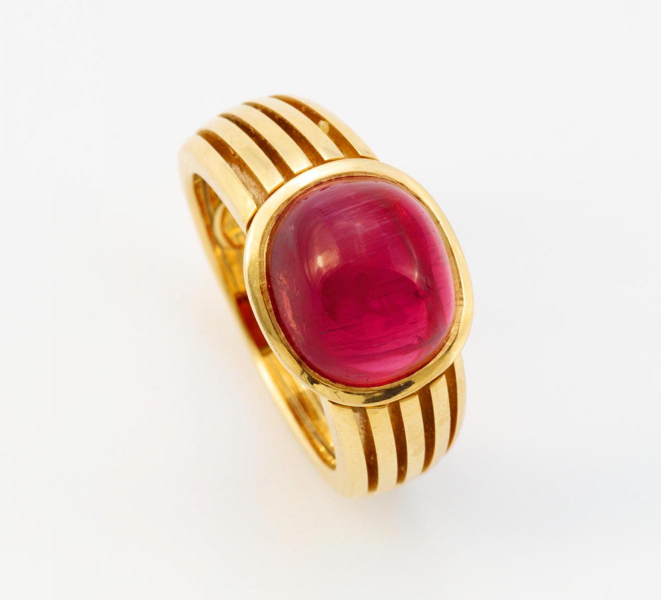 750/- Gelbgold, gestempelt, Gewicht: 9,0g. EU-RM: 53,5. 1 Rubellit-Katzenauge im Cabochonschliff.
