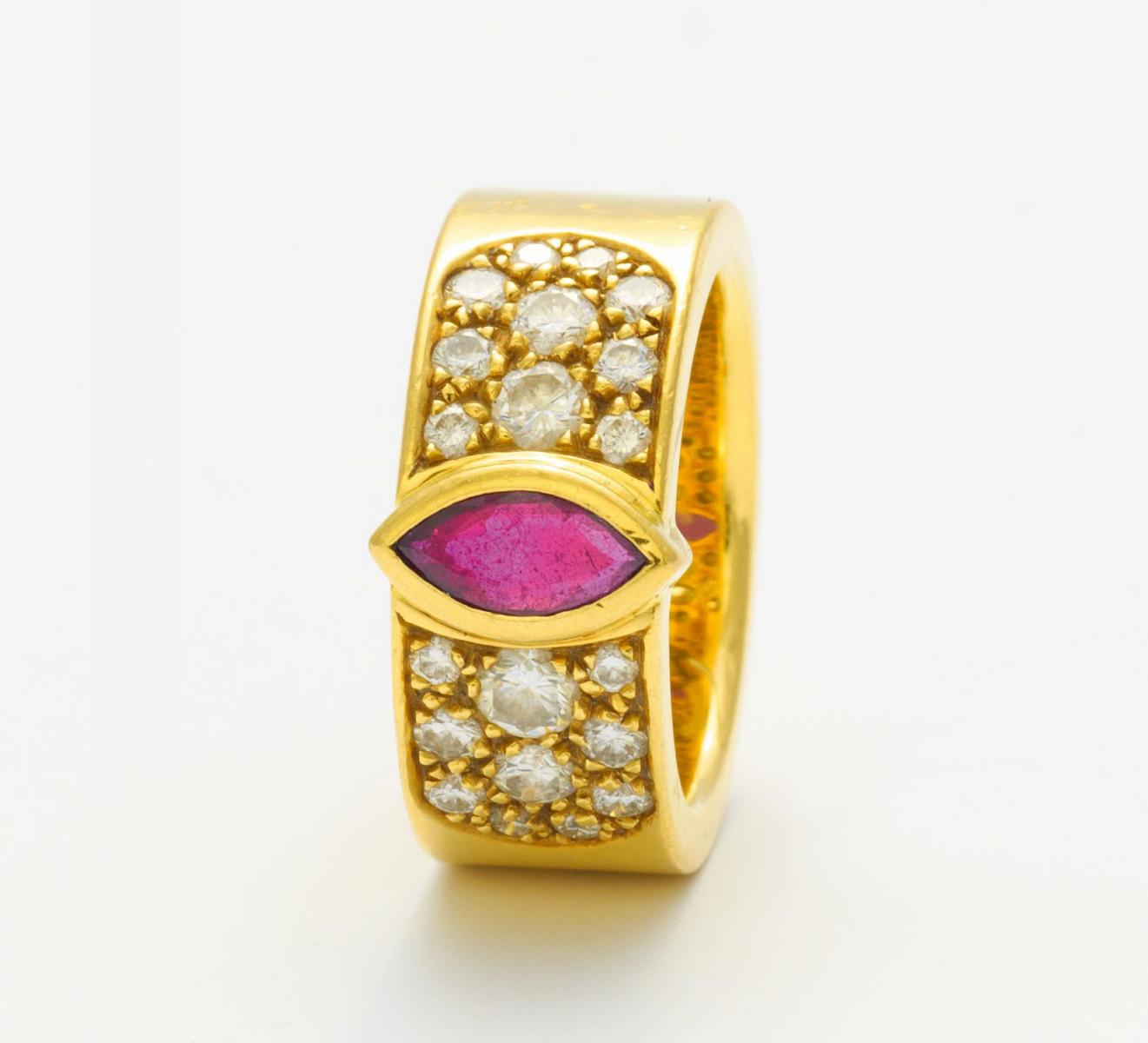 750/- Gelbgold, gestempelt, Gewicht: 18,0g. EU-RM: 52. 20 Brillanten, 1 Rubin-Navette.