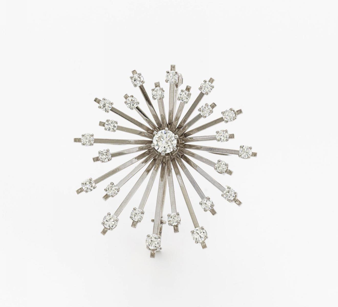 750/- Weißgold, Gewicht: 9,8g. H x B=ca. 3,8 x 3,3cm. 25 Brillanten zus.ca. 1,765ct W(H) VVS-VS.