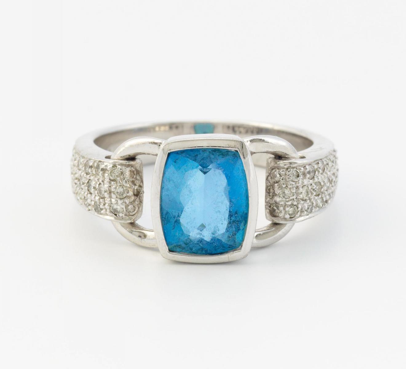 750/- Weißgold, Gewicht: 11,0g. EU-RM: 64. Ringtop: H x B=ca. 1,2 x 1,5cm. Ca. 50 winzige Diamanten zus.ca. 0,15ct, 1 facettierter Aquamarin im Emerald Cut ca. 2,37ct.