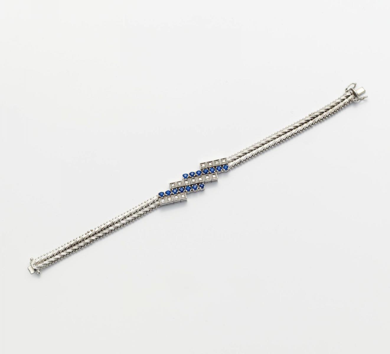 750/- Weißgold, gestempelt, Gewicht: 25,0g. L.ca. 18,0cm. 15 8/8-Diamanten, 14 rund facettierte Saphire.