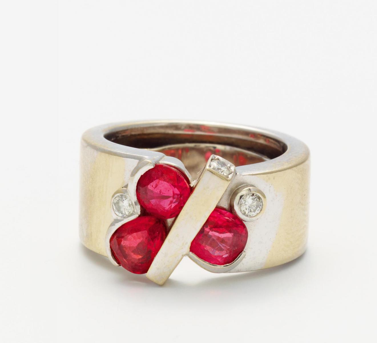 750/- Weißgold, Gewicht: 16,0g. EU-RM: 54. 2 Brillanten, 3 rote facettierte Spinelle.