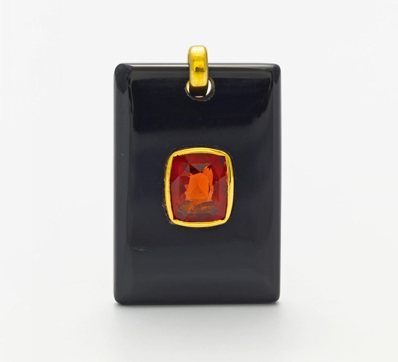 Öse und Fassung: Goldfarben, Gewicht: 11,5g. H x B=ca. 3,5 x 2,5cm (ohne Öse). 1 facettierter Hessonit (Granat-Gruppe) im Scherenschliff, 1 Onyx-Platte.