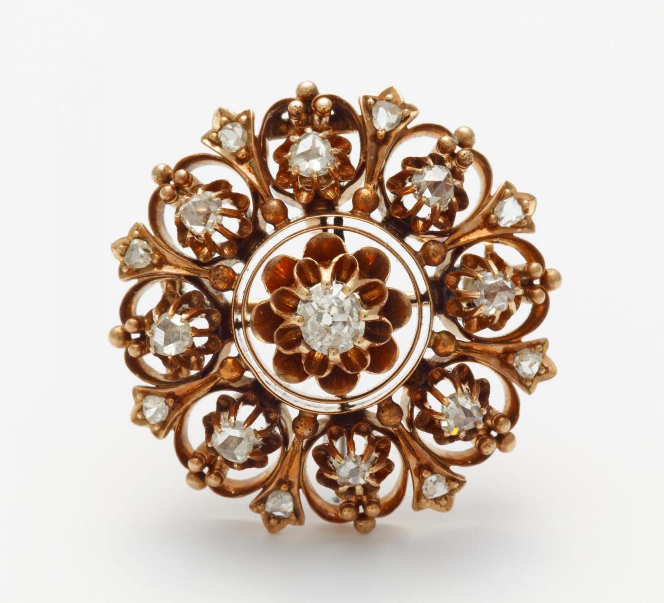 Rotgold, Gewicht: 9,5g. D.ca. 2,7cm. 17 Diamanten im Alt- und Rosenschliff.