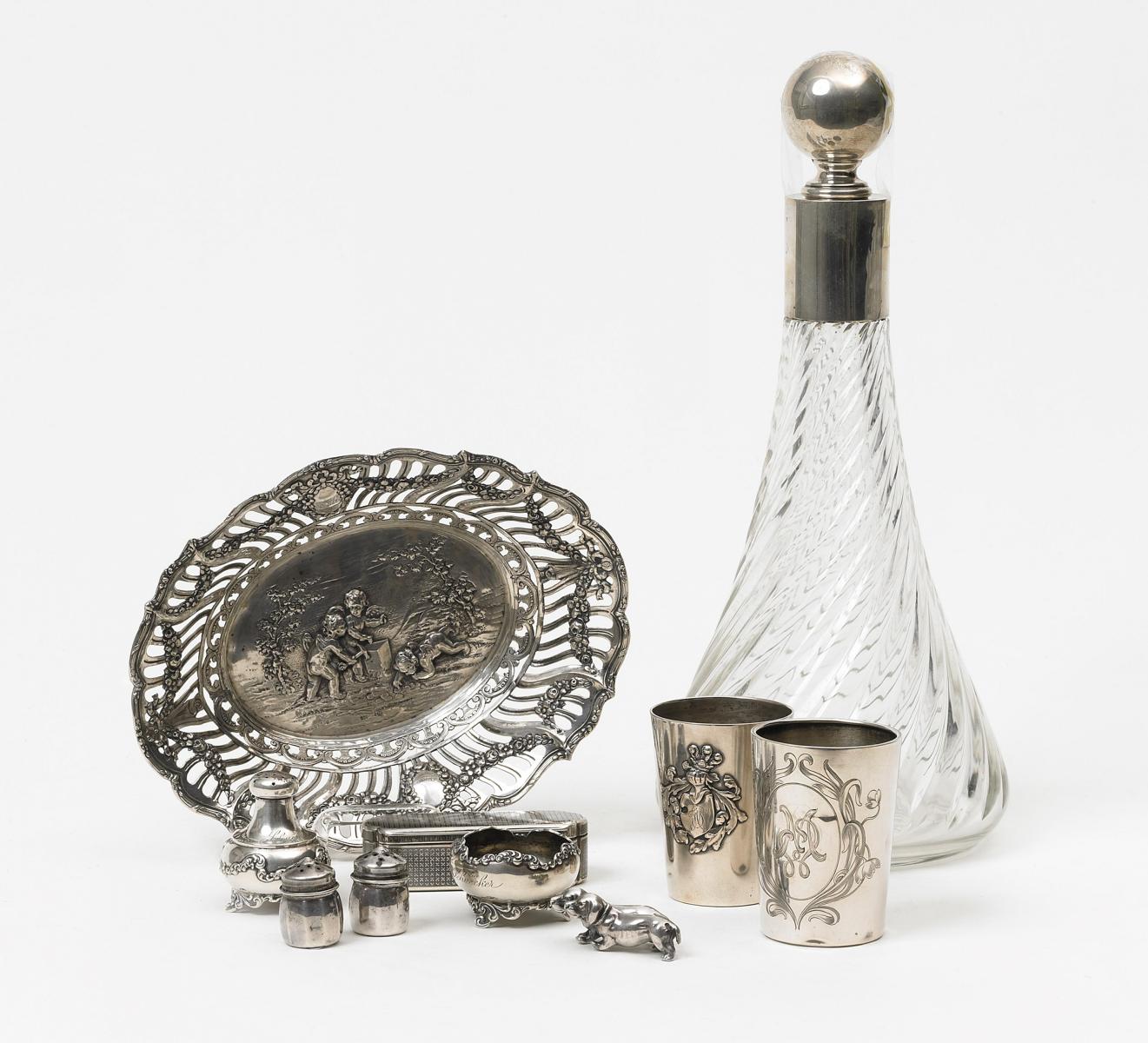 Silber, Glas. {Bei.:} Dackelpaar. Versilbert. Ca. 464g.