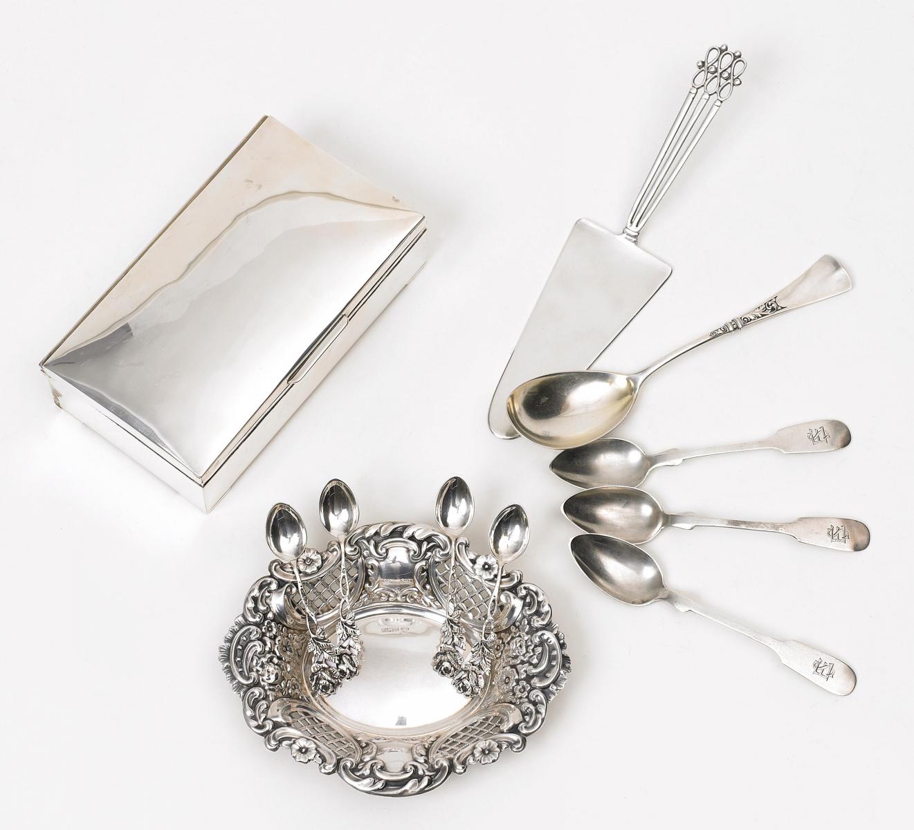 KONVOLUT ZIGARRENKISTE, KUCHENHEBER, KONFEKTSCHÄLCHEN, 8 LÖFFEL VERSCHIEDEN.