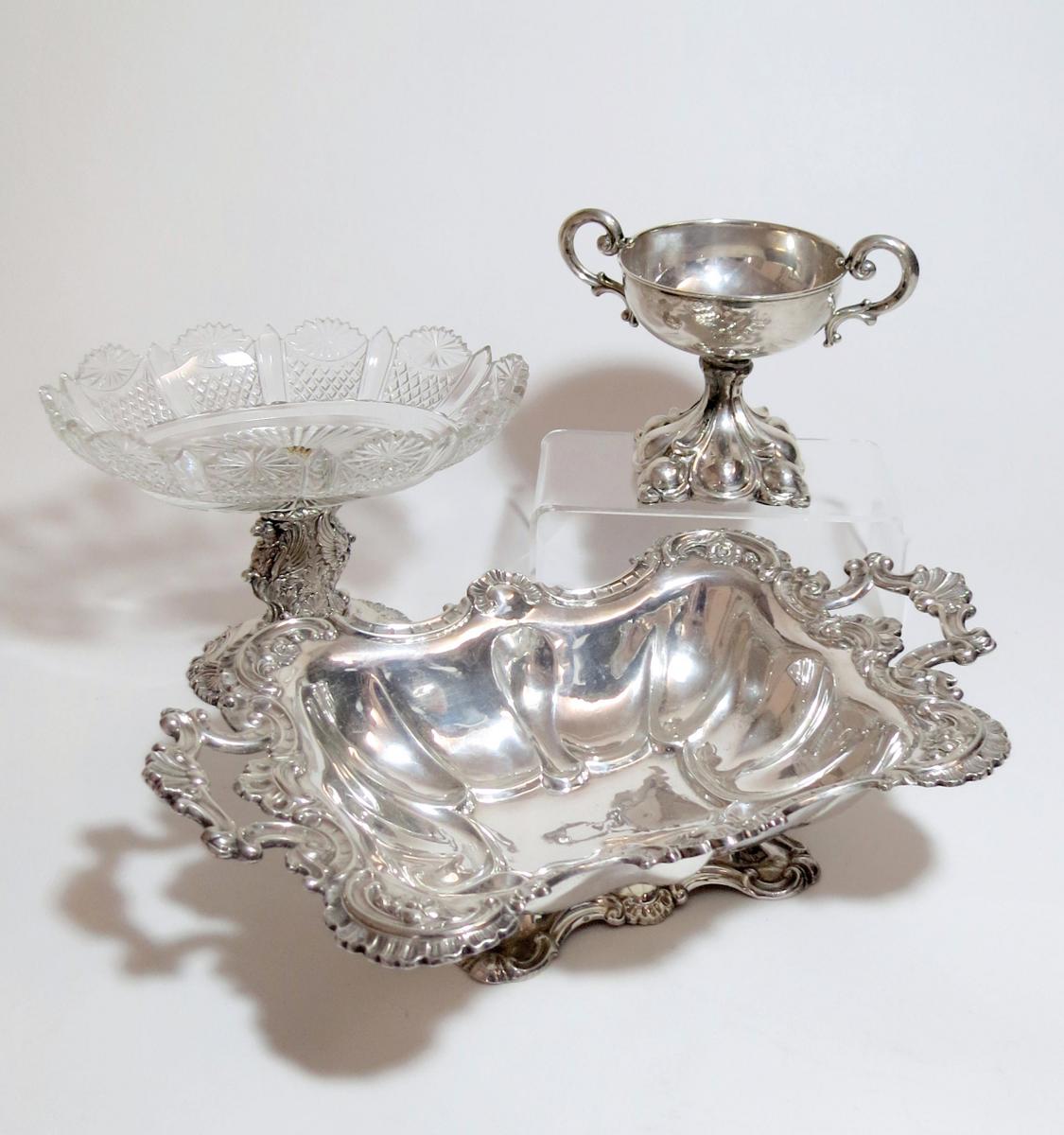 Silber, Kristallschale. {Beil.:} Kleine Aufsatzschale. Ca. 370g. 9x35,5x22 und 15,522,5x15cm.