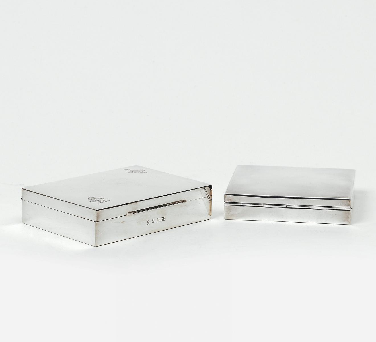 Silber, Holzeinsatz. 2,5x11x11cm und 3x13x10cm.
