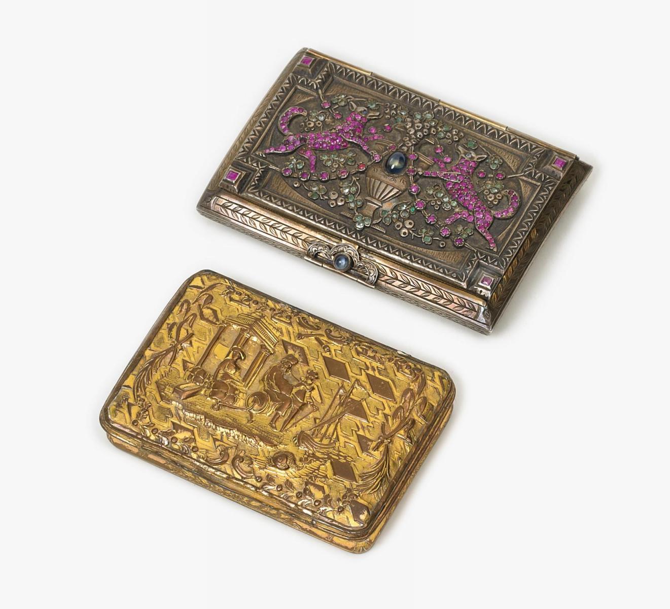 Silber, vergldet. Farbiger Steinbesatz. {Beil.:} Dose mit Hafenszene. Kupfer. Ca. 101g.