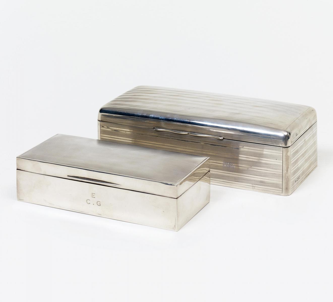 Silber, Holzkern, Leder. 8x25,5x11,5cm/5,5x20,5x9cm.