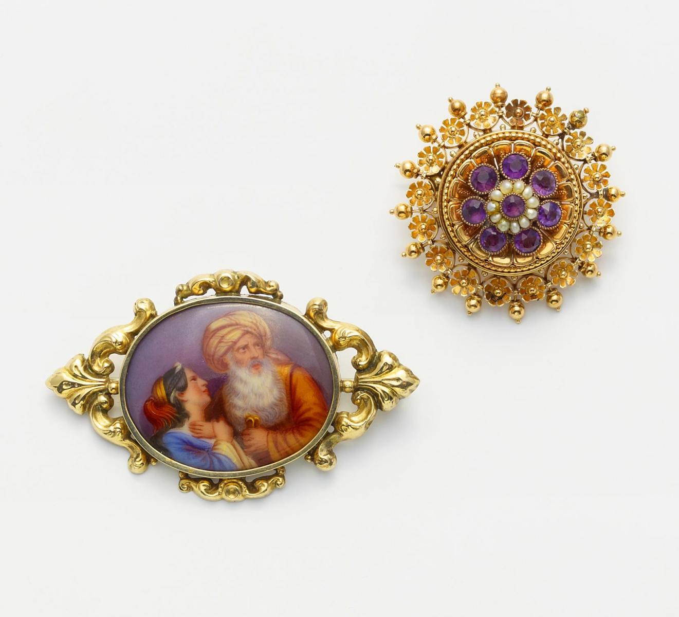 Goldfarben, Porzellanmalerei, Gewicht: 16,5g. D.ca. 5,5 x 3,4cm, D.ca. 3,5cm. 7 rund facettierte Amethyste, 12 Saatperlen.