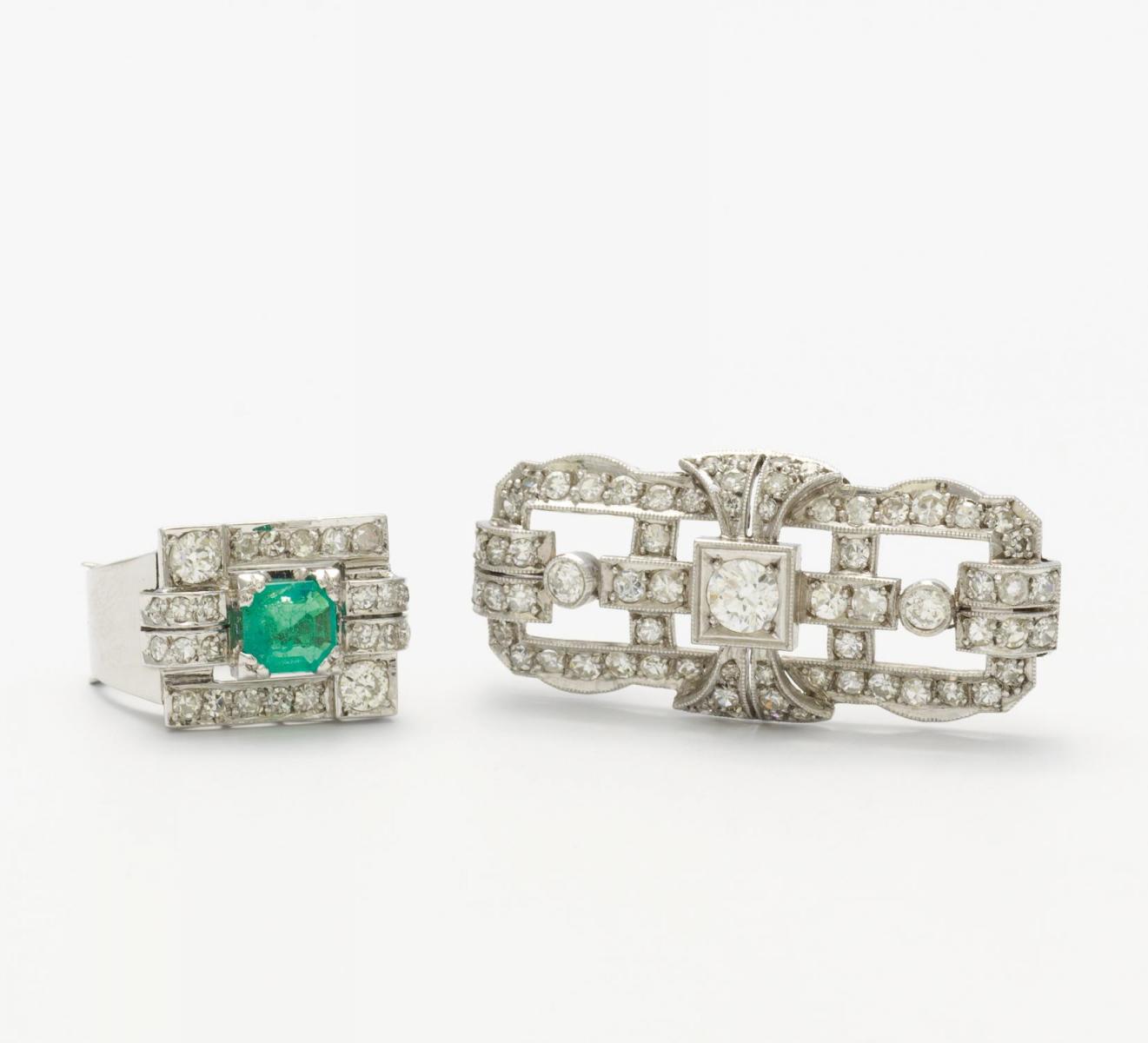 Ring: 750/- Weißgold, gestempelt; Brosche: Goldfarben, Gewicht: 1. 8,0g, 2. 8,5g. EU-RM: 49. Brosche: 3,3 x 1,3cm. Vielzählige Diamanten, 1 Smaragd im Emerald Cut.