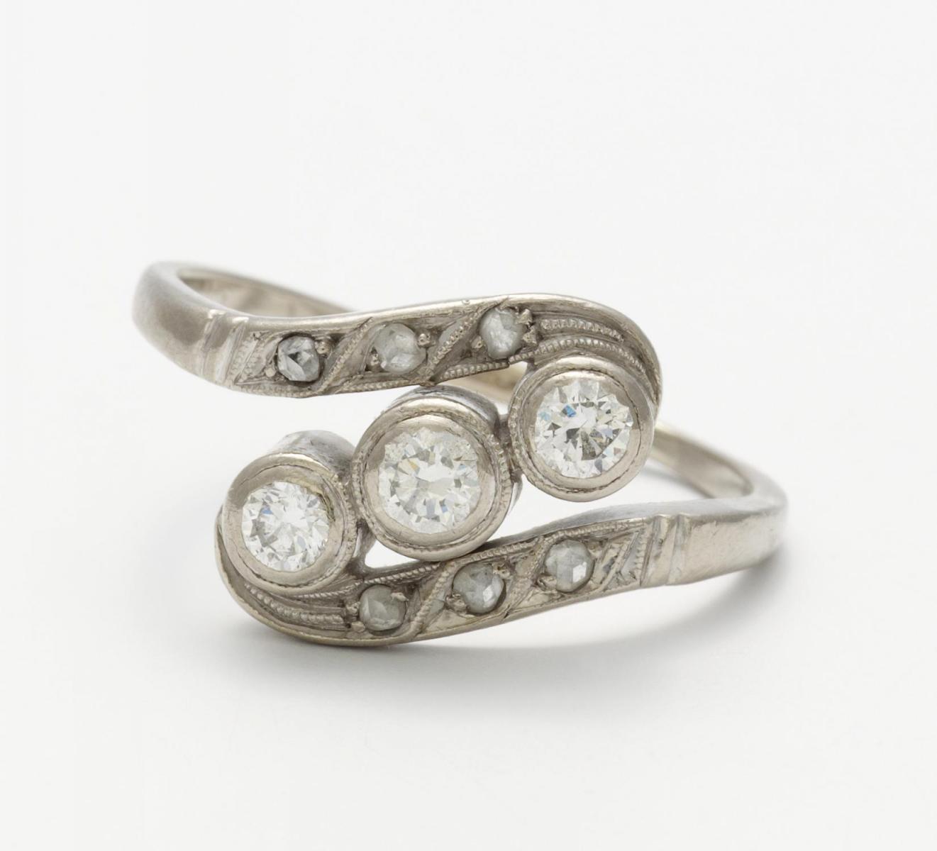 Weißgold, Gewicht: 4,5g. EU-RM: 58. 6 Diamantrosen, 3 Brillanten.