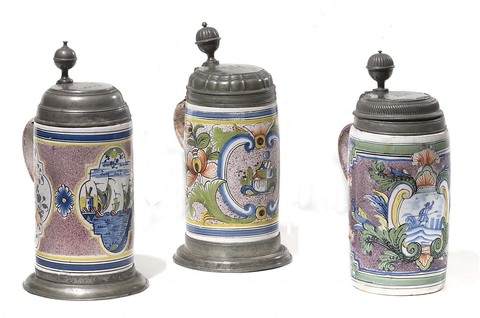 DREI WALZENKRÜGE MIT KARTUSCHEN.