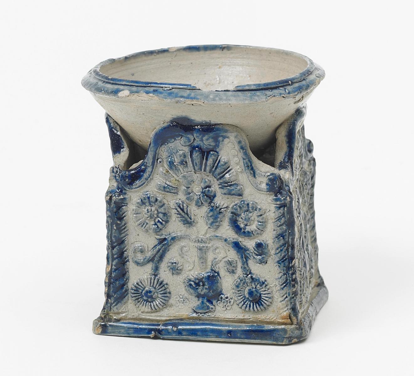 Graues, salzglasiertes Steinzeug, blaues Dekor. H.7,5 cm. Zustand B/C.