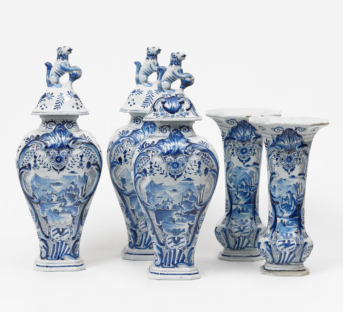 SATZ DREI DECKELVASEN UND ZWEI STANGENVASEN.