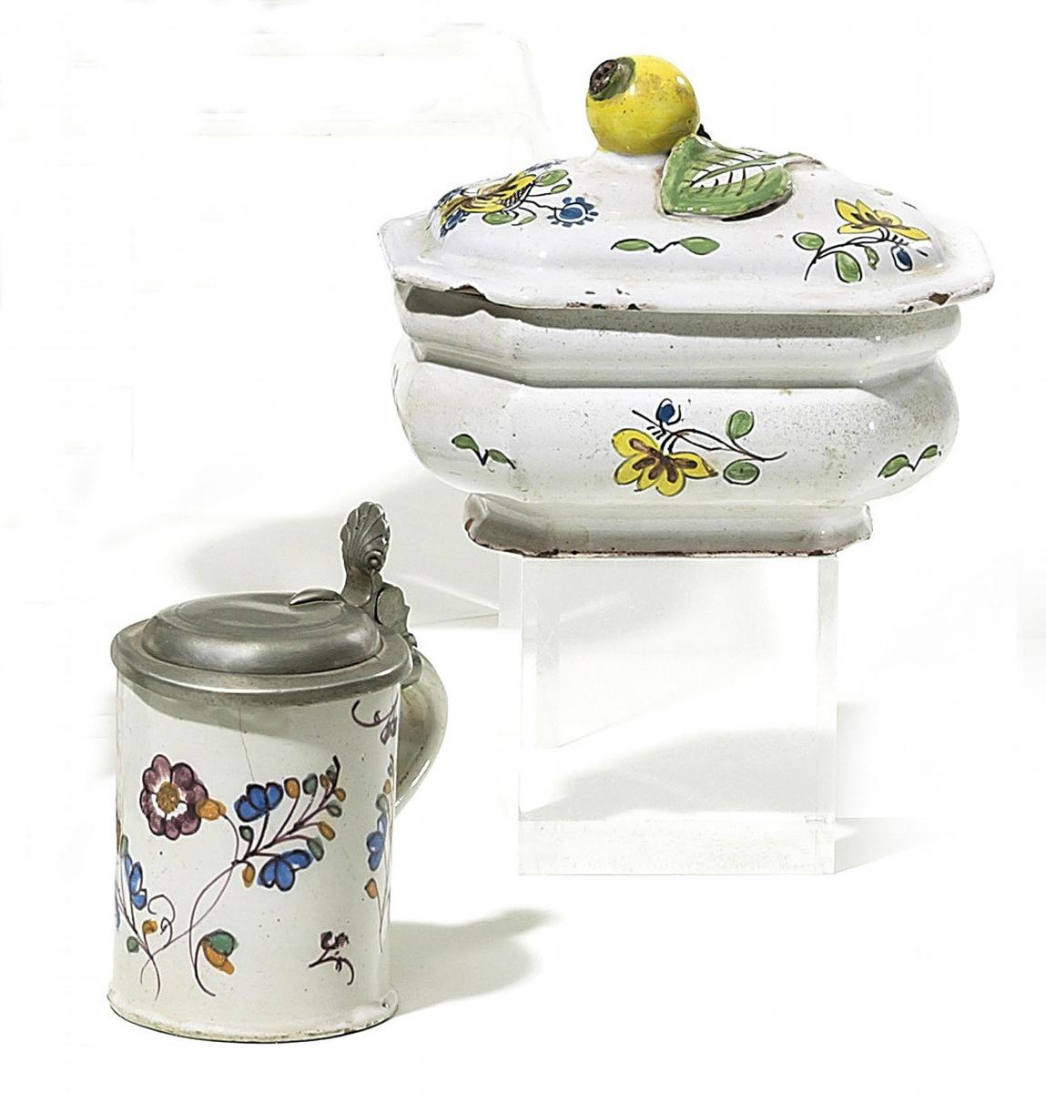 Sandfarbener Scherben mit weißer Glasur und farbigem Dekor. Einmal scharnierter Zinndeckel. 11x13,5x9,5 cm.