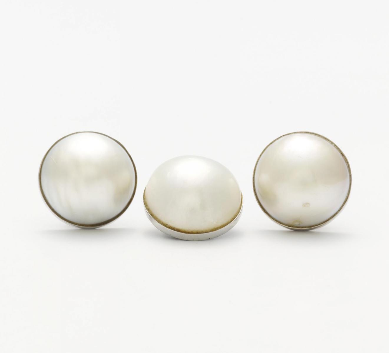 Weißgold, Gewicht: 18,0g. D.ca. 1,8cm. 3 Mabé-Zuchtperlen, weiß-rosé-creme, D.ca. 17,5mm.