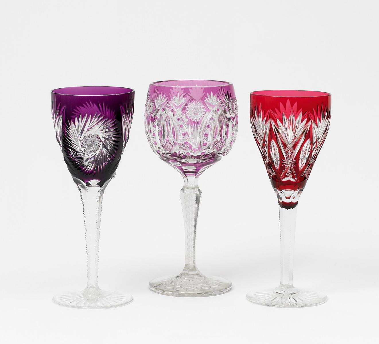 Glas, rotes und violettes Dekor. H.28cm/28,5/29 cm. Zustand A-A/B.