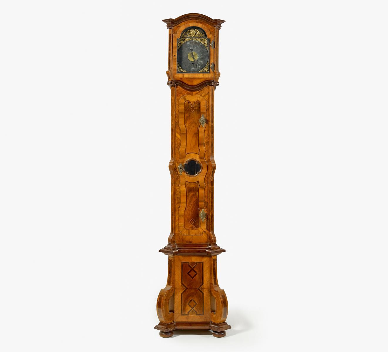 Nussbaum und andere Hölzer eingelegt. Werk ergänzt. H.260 cm. Zustand C.