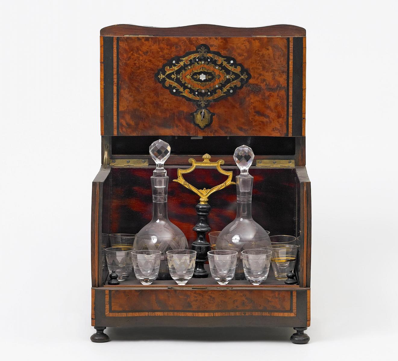 Wurzelholz, tlw. Messing- und Perlmutteinlagen. Innen Tablett mit zwei Karaffen und elf tlw. ergänzte Gläser. 26x28x20 cm. Zustand C.
