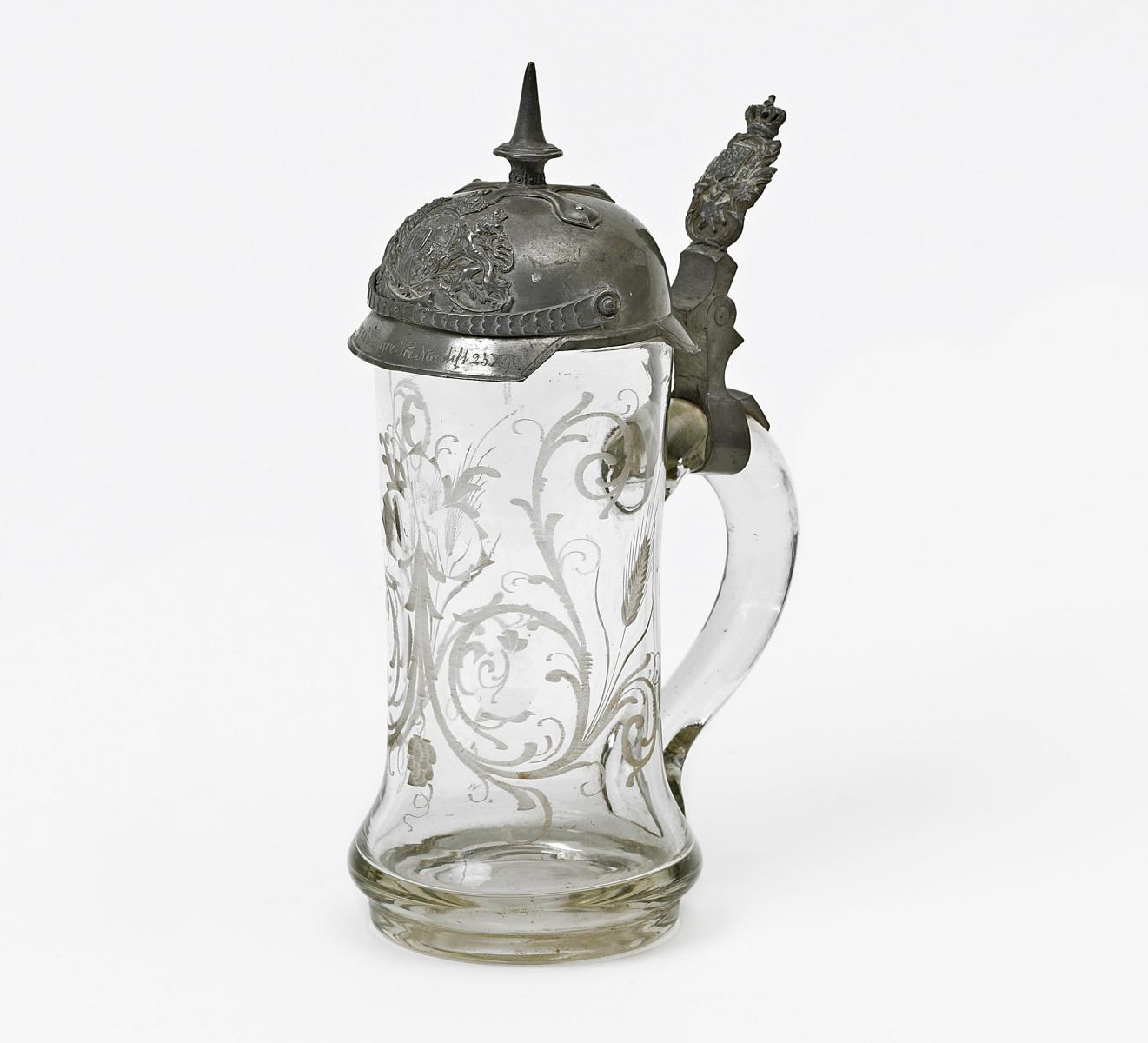 Glas mit Zinndeckel. H.21,5 cm. Zustand B.