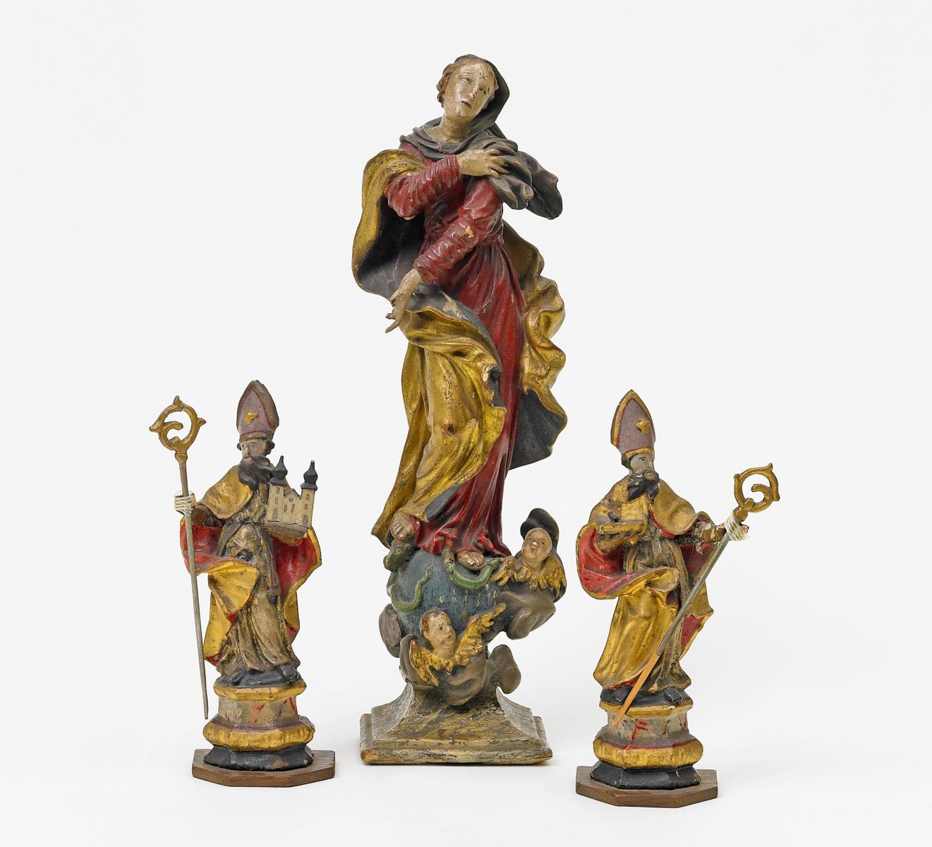 Holz geschnitzt und gefasst. {Beil.:} Zwei Hl. Bischöfe. H. mit Sockel 45 cm. Zustand B/C.
