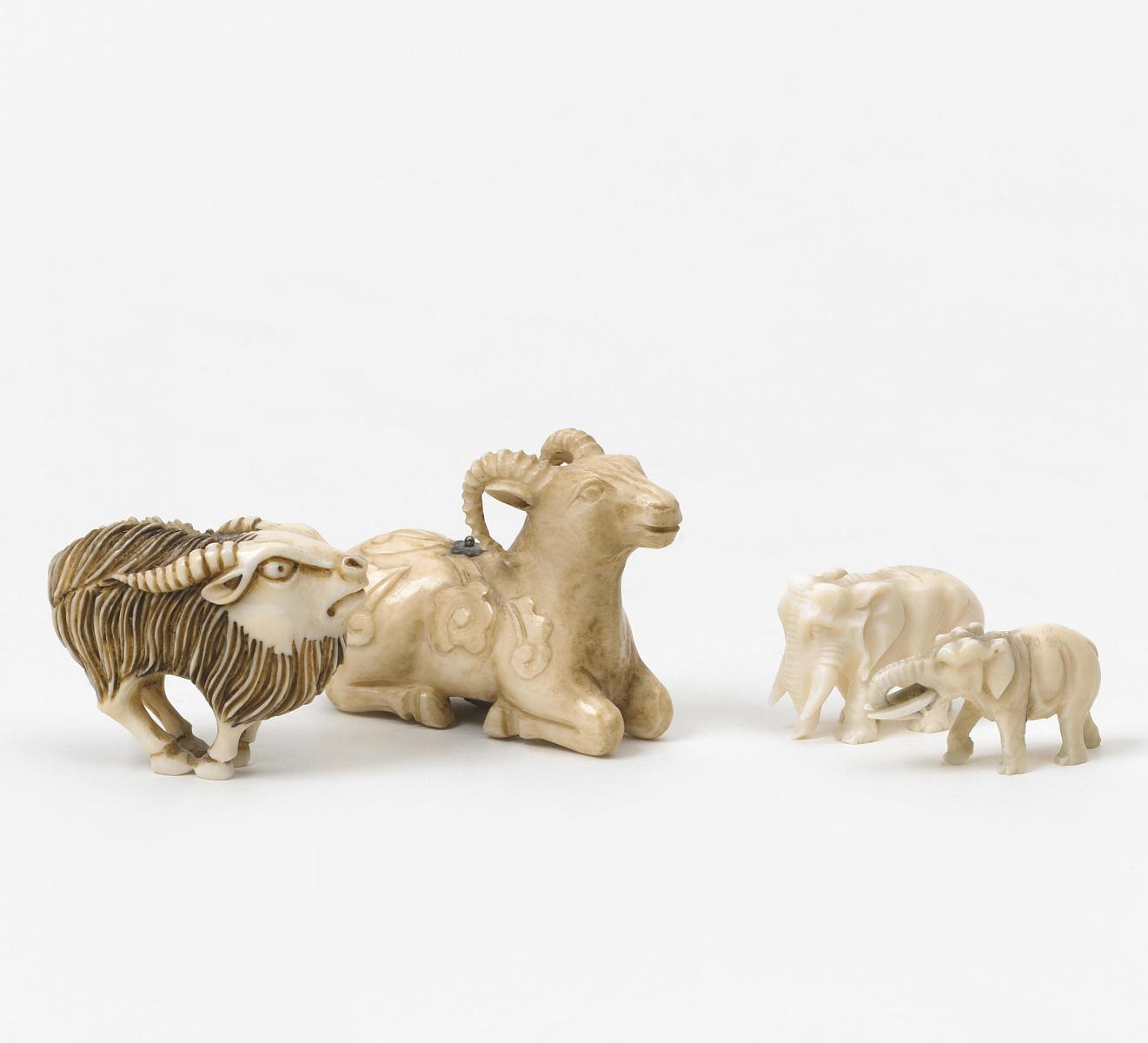 KONVOLUT ZWEI KLEINE ELEFANTEN, WIDDER UND ZIEGENBOCK.
