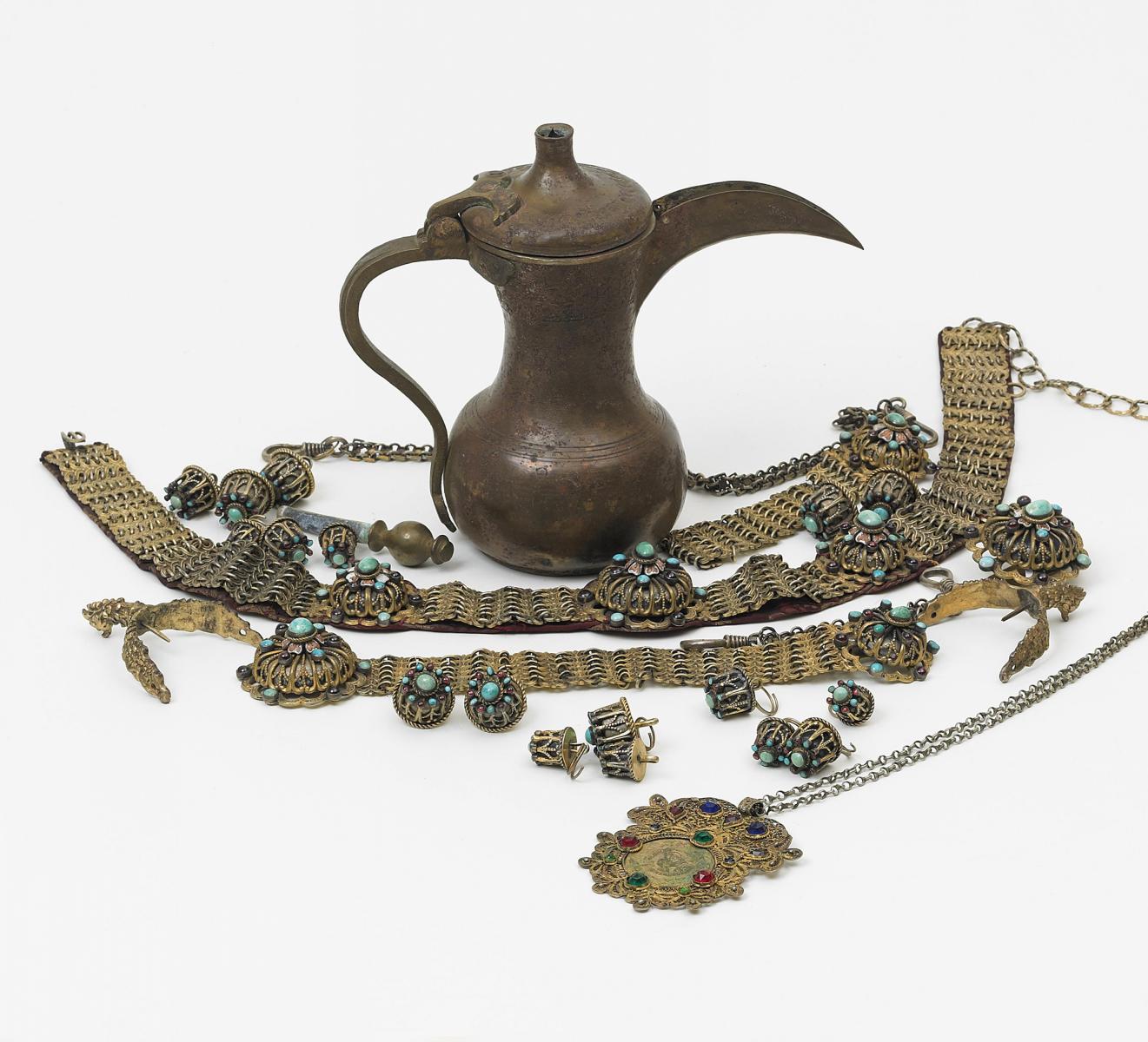 Messing mit Farbsteinen und Glas besetzt, tlw. mit Stoff hinterfüttert. {Beil.:} Schenkkanne. Zustand B/C.