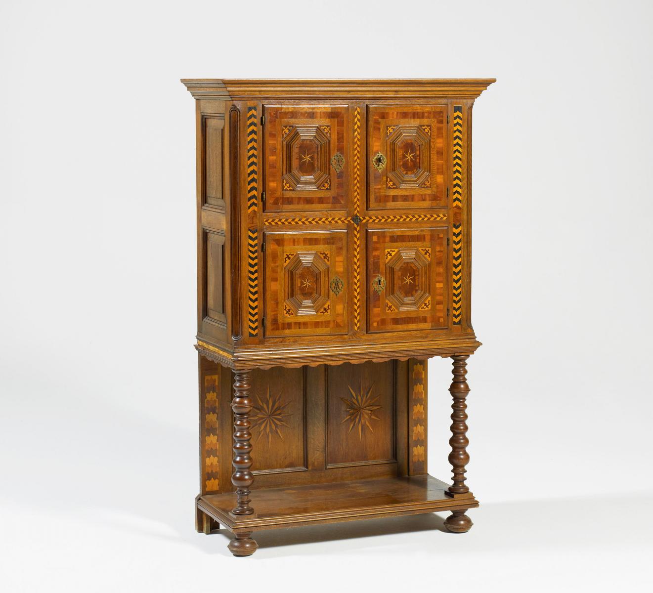 Eiche, verschiedene Obsthölzer eingelegt. 177x111x50 cm. Zustand B.