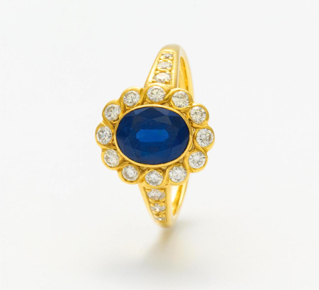 750/- Gelbgold, gestempelt, Gewicht: 5,5g. EU-RM: 53. 18 Brillanten, 1 oval facettierter Saphir.