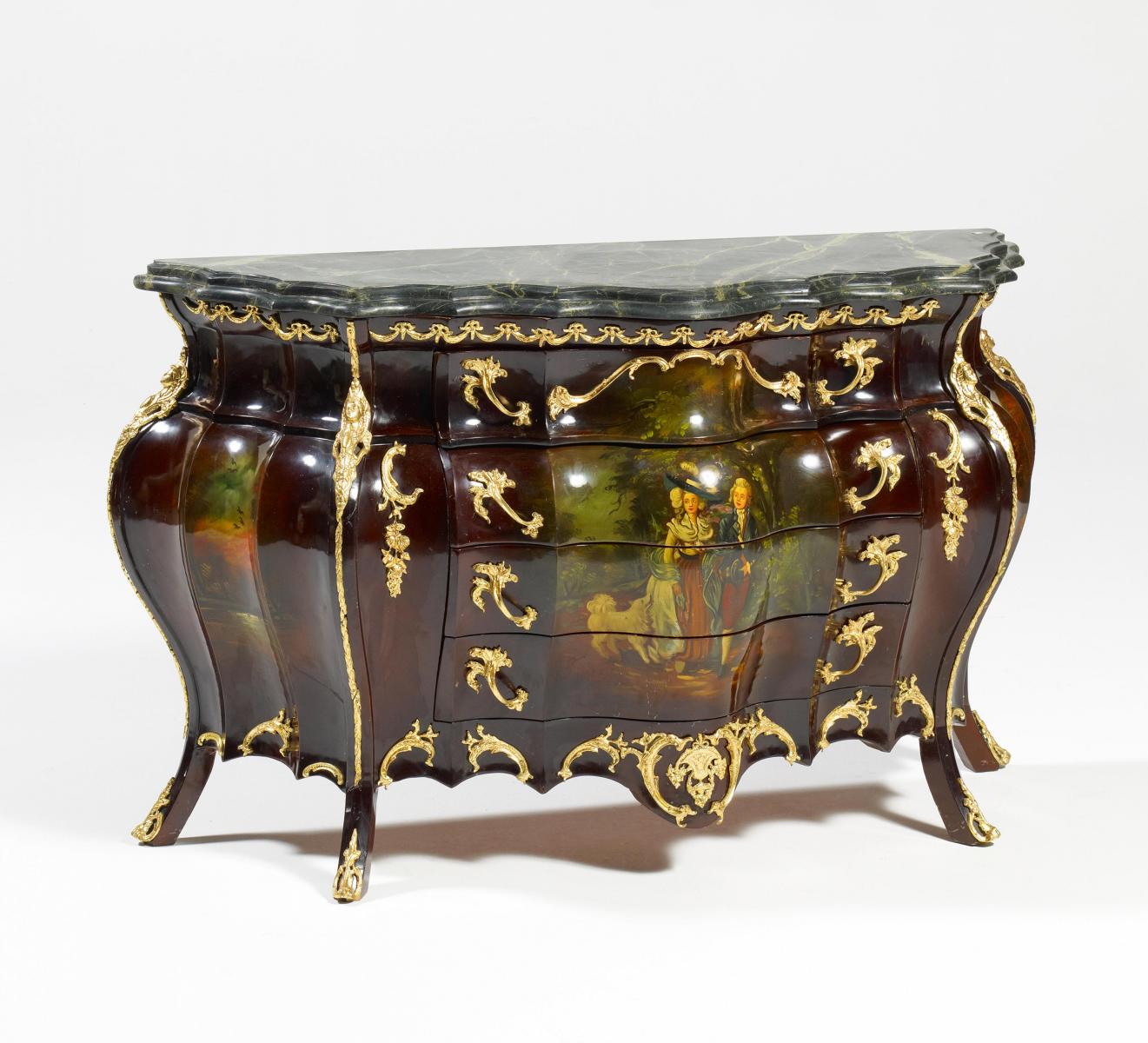 Holz bemalt. Marmorplatte. Reiche Applikationen. 93x189x150 cm. Zustand B.