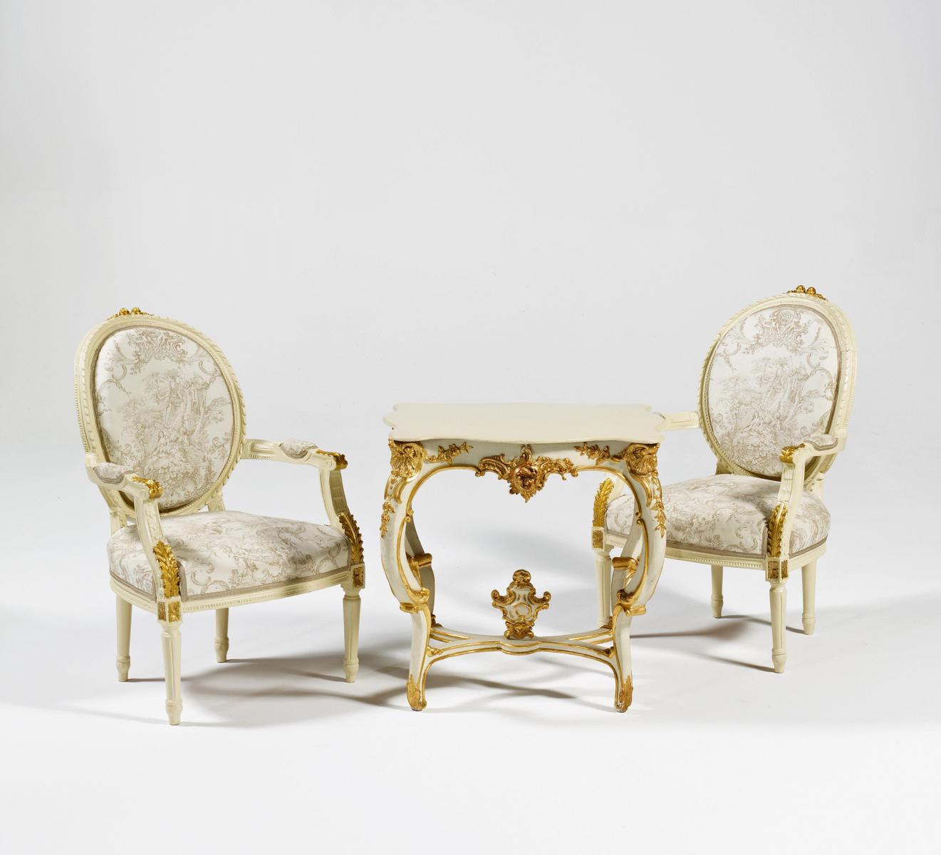 Holz beige und gold gefasst. Gepolstert. Bestehend aus zwei Armlehnsesseln und Tisch. Zustand B.