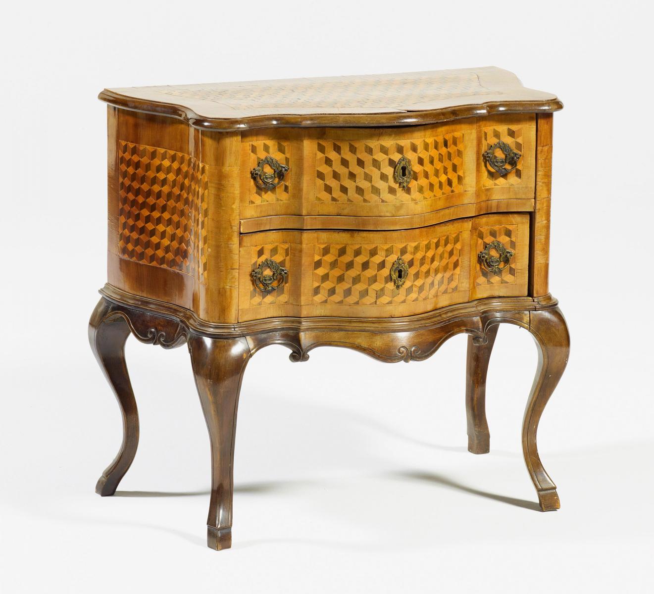 Nussbaum und andere Hölzer eingelegt. 84x90x52 cm. Zustand C.