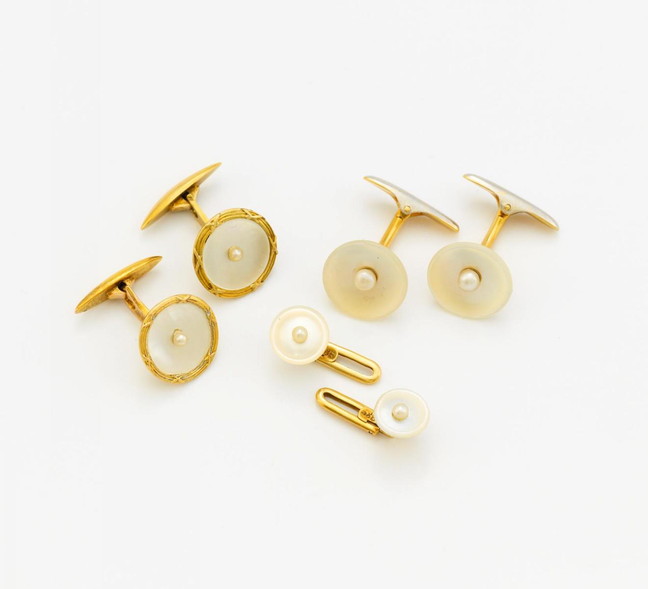 1 Paar Hemdknöpfe, 585/- Gelbgold, ca. 3,0g, 6 Perlmuttscheiben D.ca. 1,3-1,0cm, 6