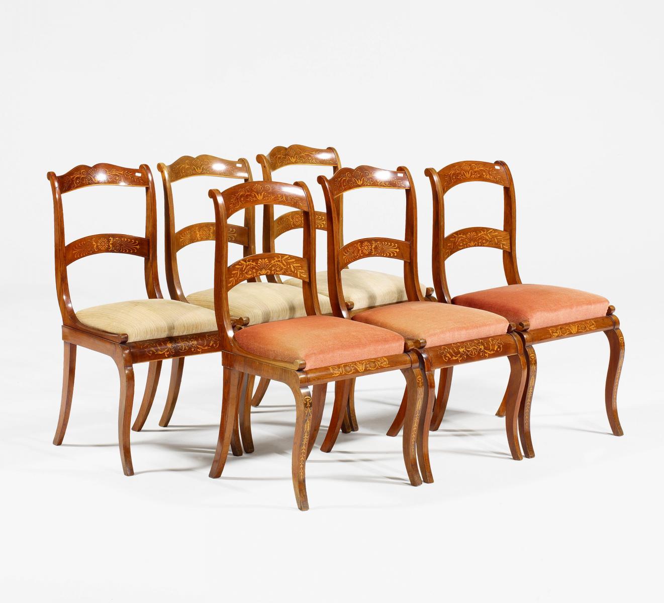 Mahagoni. Ahorneinlagen, gepolstert. Beil.: 3 Stühle. H.91 cm. Zustand B/C.
