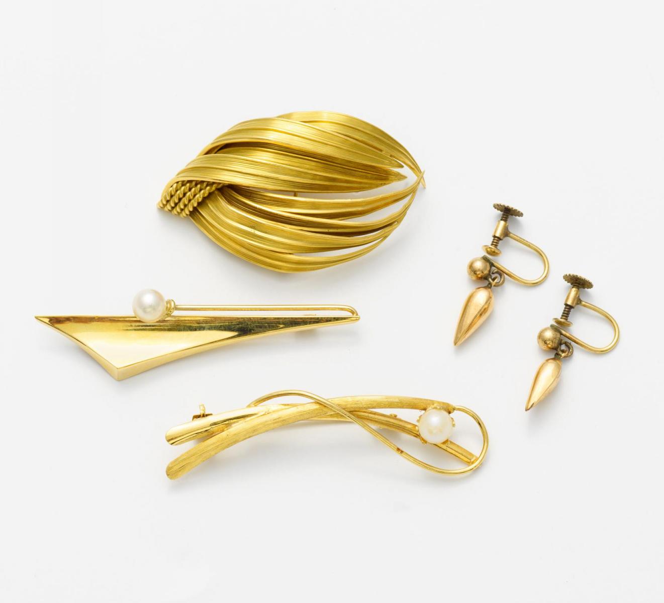 1 Brosche: 750/- , 2 Broschen: 585/- Gelbgold, gestempelt, Gewicht: 1. 12,0g, 2. 8,0g. D.ca. 4,5 x 2,5cm, L.ca. 5,1cm. 2 Süßwasser-Zuchtperlen, weiß, rosé, D.ca. 5mm.