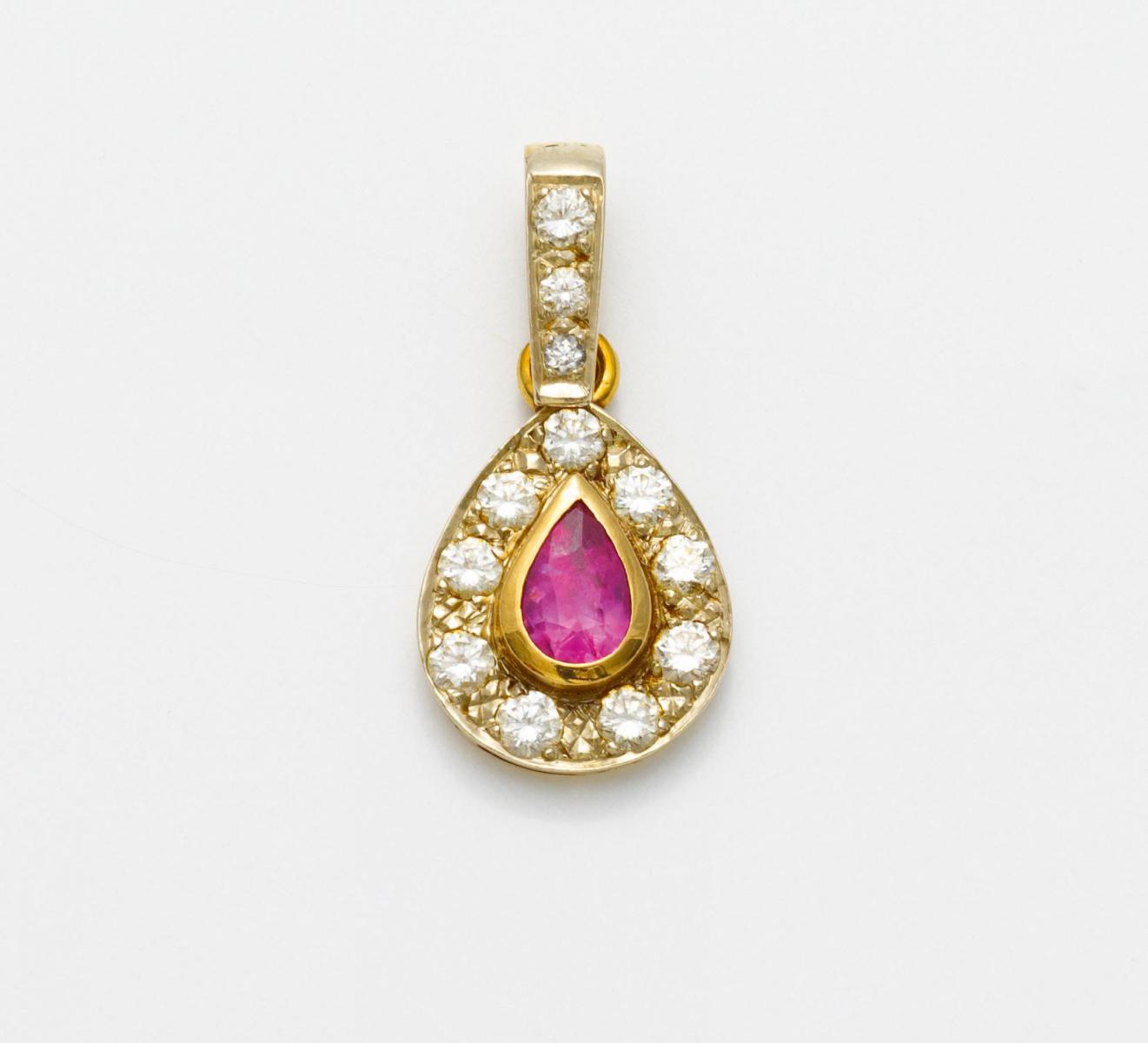585/- Gelbgold, gestempelt, Gewicht: 2,5g. L.ca. 2,5cm. 12 Brillanten, 1 oval facettierter Rubin-Tropfen.