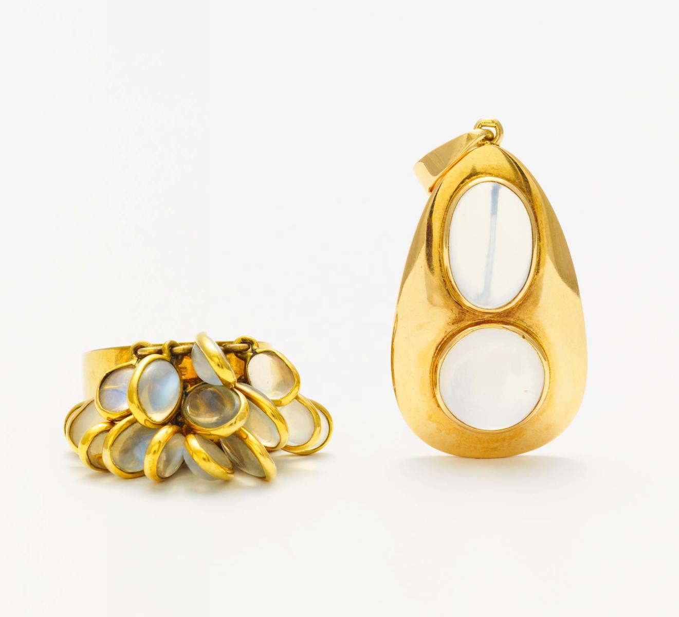 Ring: Goldfarben, Anhänger: 585/- Roségold, gestempelt (verschlagen), Gewicht: 1. 8,0g, 2. 6,0g. EU-RM: 55. Anhänger: H x B=ca. 4,3 x 2,1cm. Anh.: 1 runder Mondstein-Cabochon, 1 ovaler Mondstein-Cabochon. Ring: 16 ovale Mondstein-Cabochons.