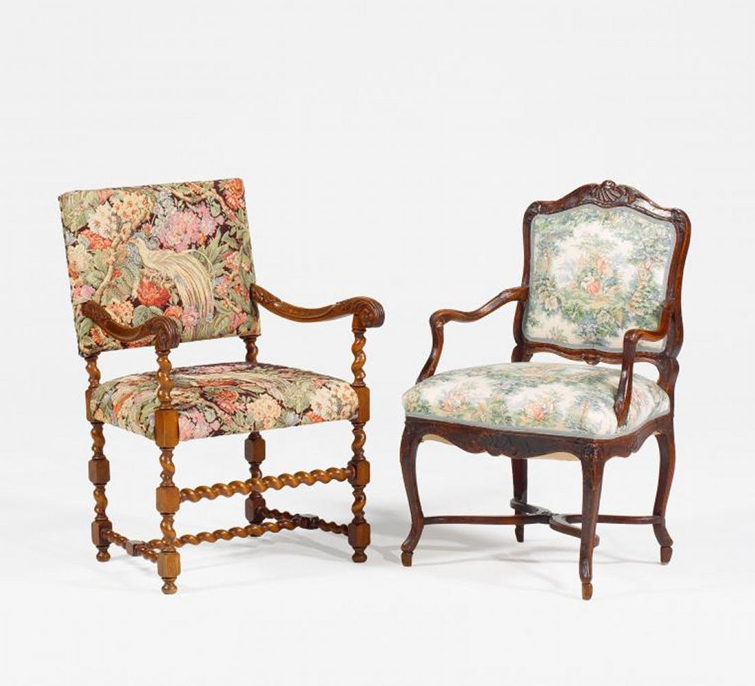 Eiche gepolstert. {Beil.:} Armlehnsessel. H.96 cm. Zustand B/C.