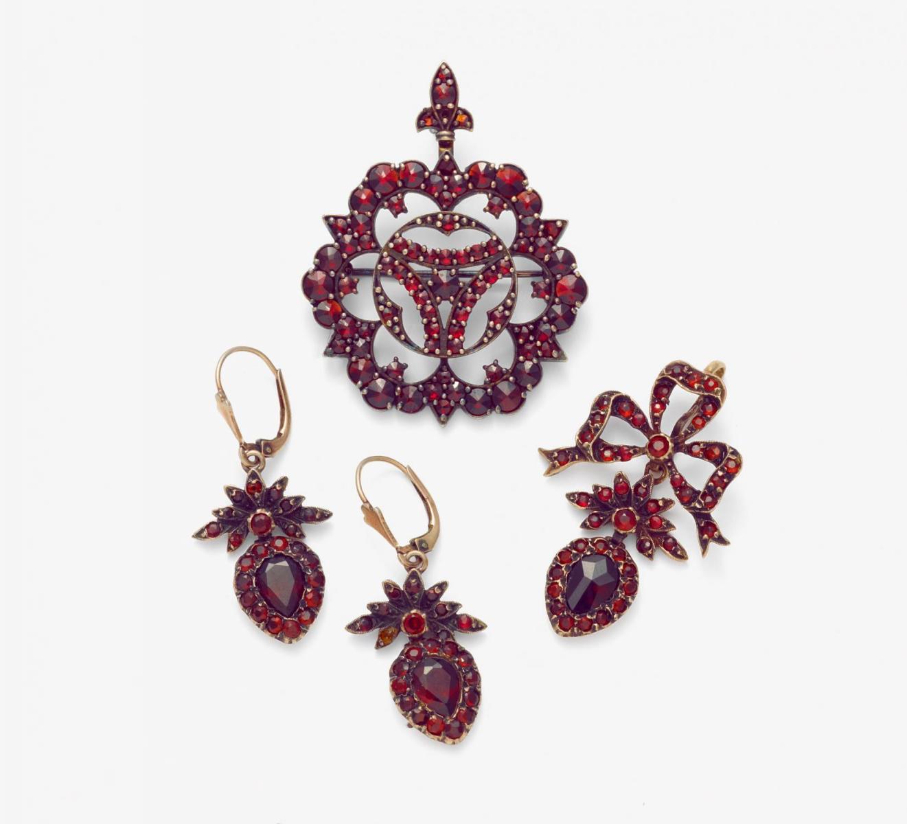 SET: GRANAT-OHRHÄNGER UND ANHÄNGER.