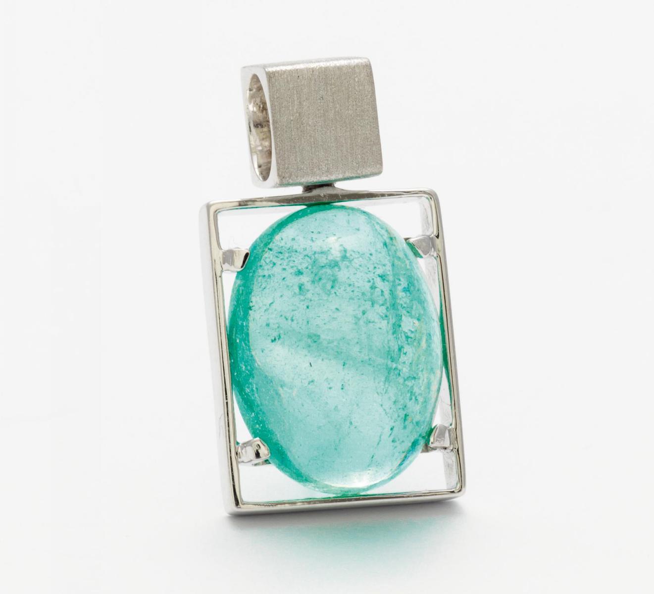 750/- Weißgold, Gewicht: 6,0g. H x B=ca. 2,4 x 1,2cm. 1 ovaler Smaragd-Cabochon.