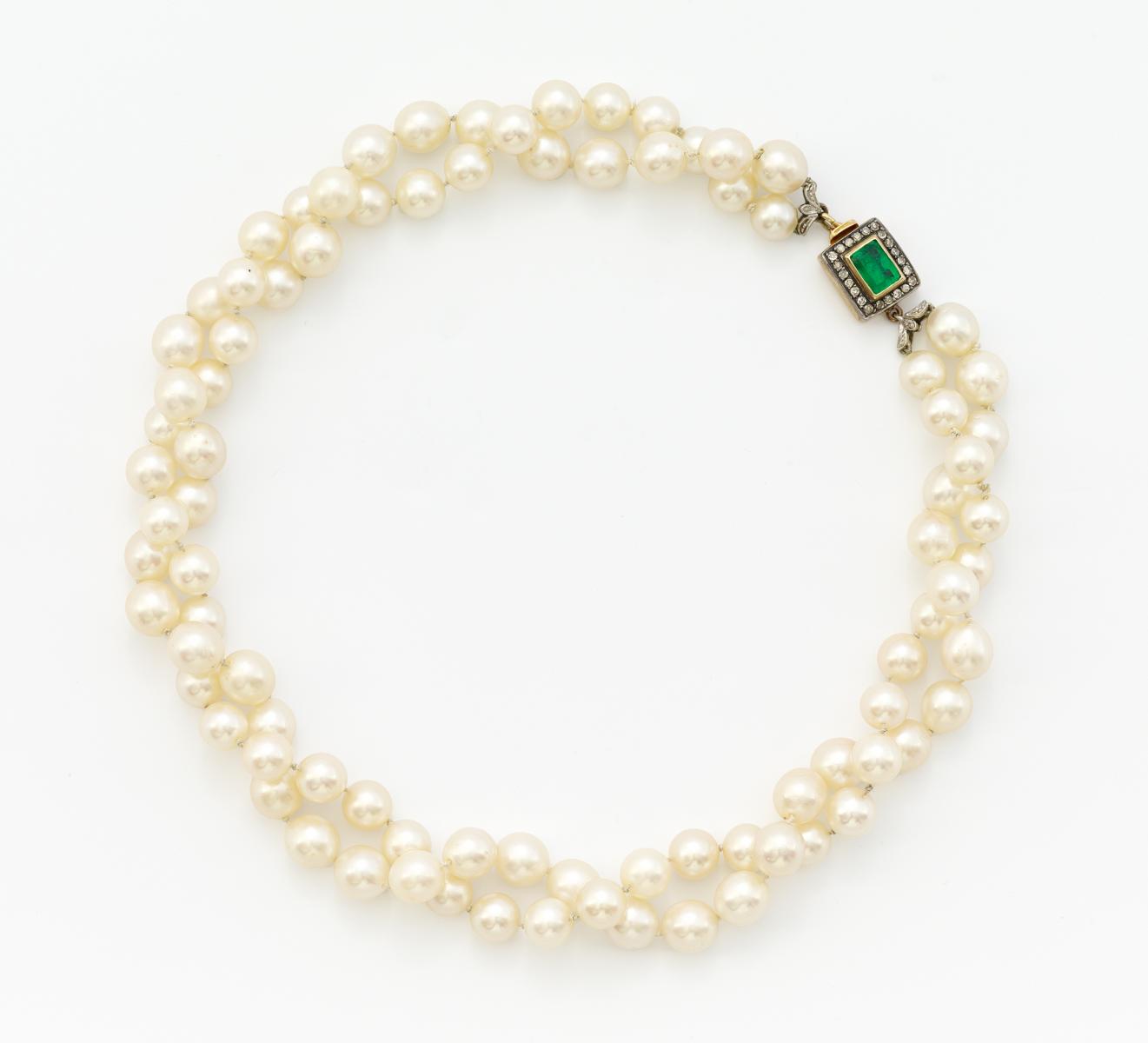 Zierschloss: 585/- Roségold, Platinverbödung, Gewicht: 85,0g. L.ca. 45,0cm. 22 winzige 8/8-Diamanten, 1 Smaragd im Emerald Cut ca. 1,32ct, 87 Akoya-Zuchtperlen zu 2 Strängen, rund-unrund, D.ca. 8,26-8,72mm, weiß-irisierendes rosé.