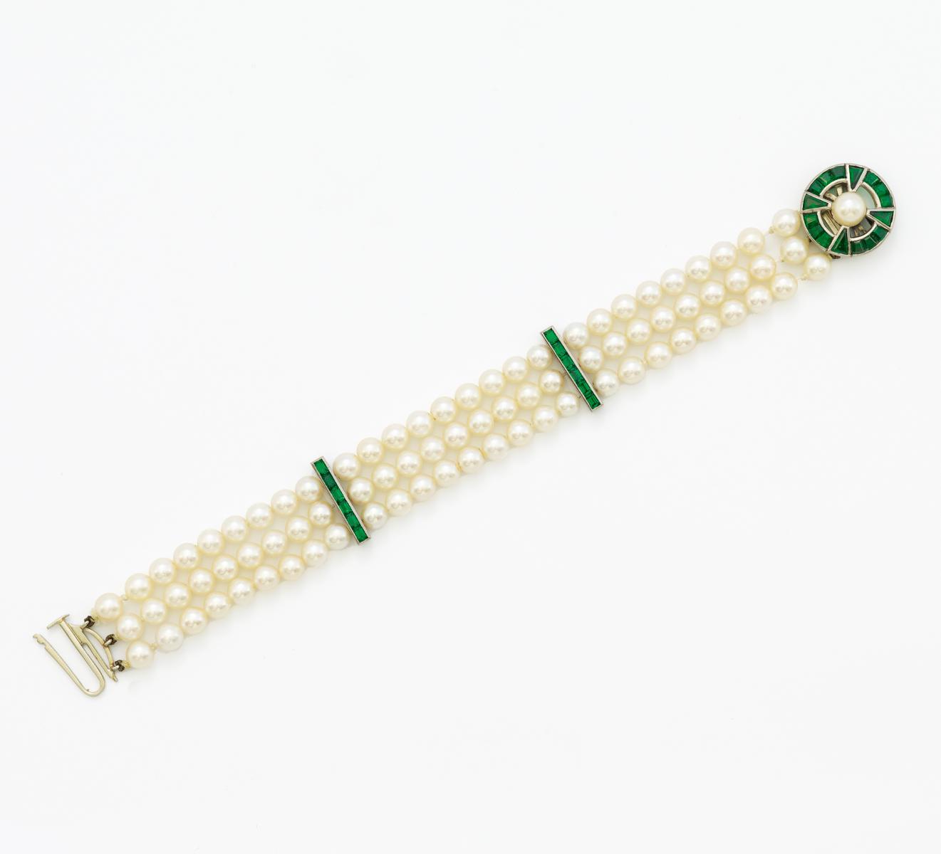 Zierschloss: 585/- Weißgold, Gewicht: 30,0g. L x B=ca. 18,0 x 2,0cm. 28 facettierte Turmaline im Baguette- und Trapezschliff, 81 Süßwasser-Zuchtperlen, rund, D.ca. 5,45mm, weiß-irisierendes rosé; 1 Süßwasser-Zuchtperl Button, D.ca. 6,65mm, weiß-creme.
