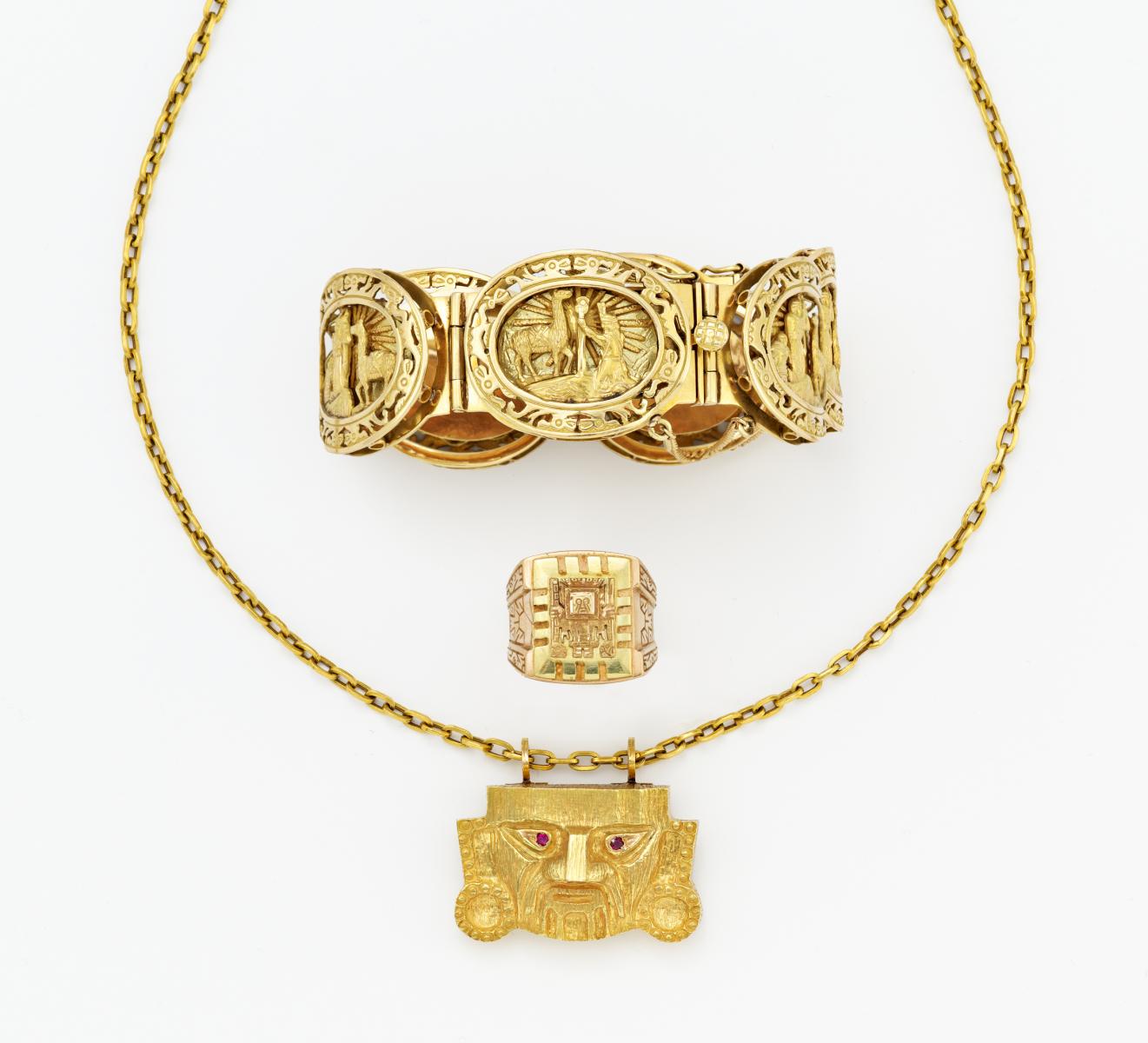 Auf dem Armband südamerikanische Szenen. Ring und Anhänger mit aztekischen Darstellungen,