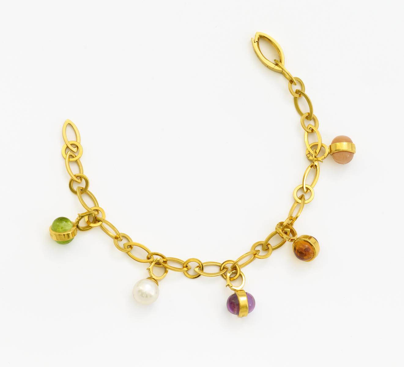 750/- Gelbgold, Gewicht: 26,5g. L.ca. 20,0cm. 1 Peridot-Perle, 1 Amethyst-Perle, 1 Citrin-Perle, 1 Mondstein-Perle D.ca. 1,0cm, 1 Süßwasser-Zuchtperle D.ca. 9,5mm, weiß-rosé.