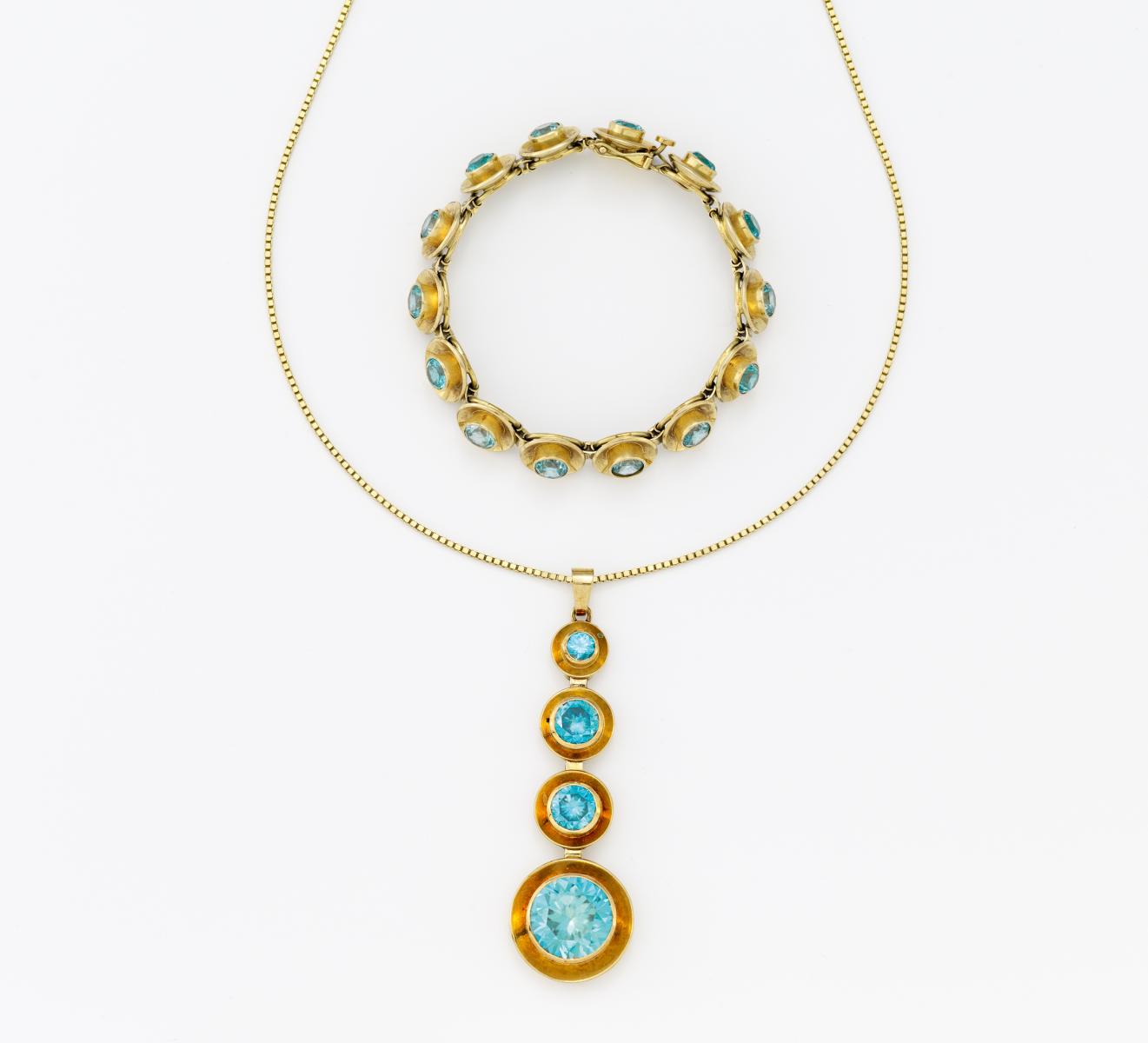 585/- Gelbgold, Gewicht: 66,9g. A.band: L.ca. 18,5cm, Anhänger: L.ca. 8,0cm, Kette: L.ca. 55,0cm. 14 rund facettierte Blautopase zus.ca. 14,84ct, 4 rund facettierte Blautopase zus.ca. 20,17ct.