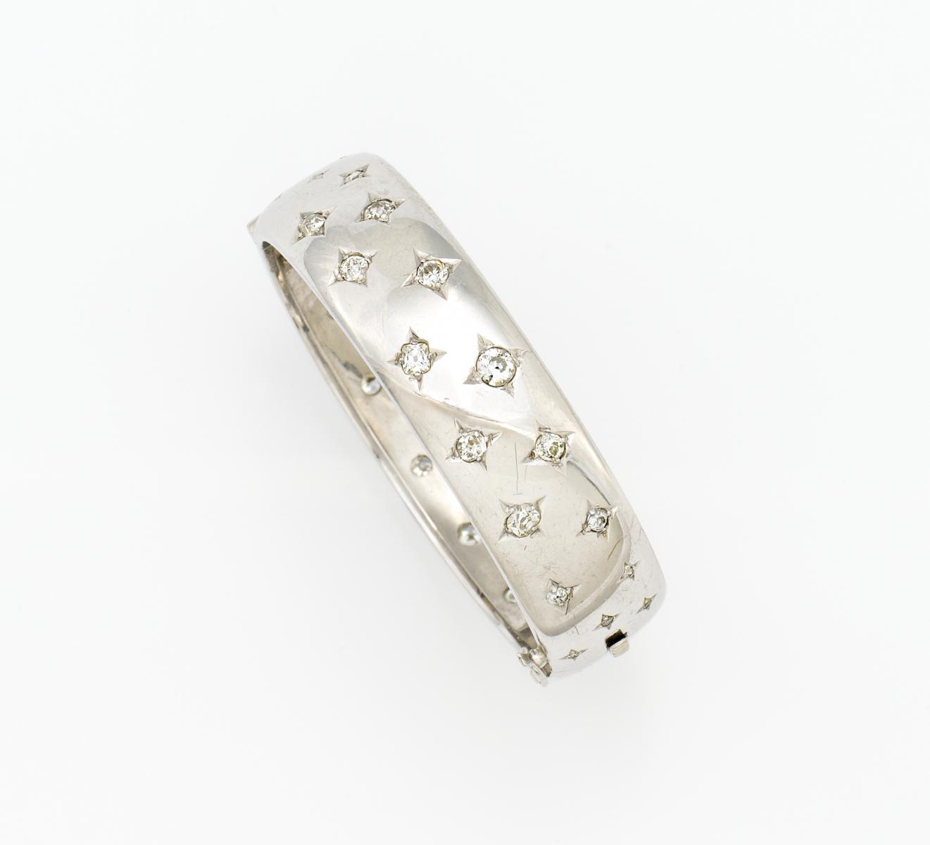 750/- Weißgold, Gewicht: 63,6g. Innendurchmesser: ca. 5,8cm, H.ca. 1,6cm. 38 Diamanten im 8/8-/Baguette- und Rosenschliff zus.ca. 2,645ct TCr-TCape(I-L) VS-P2.