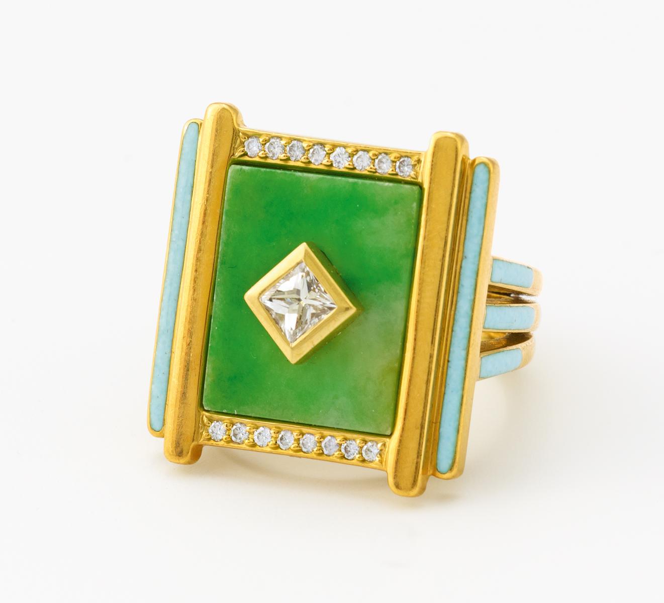 750/- Gelbgold, farbiges Email, Gewicht: 18,4g. EU-RM: 54. 1 Diamant-Karree ca. 0,31ct, 16 Brillanten zus.ca. 0,016ct, 1 Nephrit-Platte ca. 15,35x12,58x1,62mm.