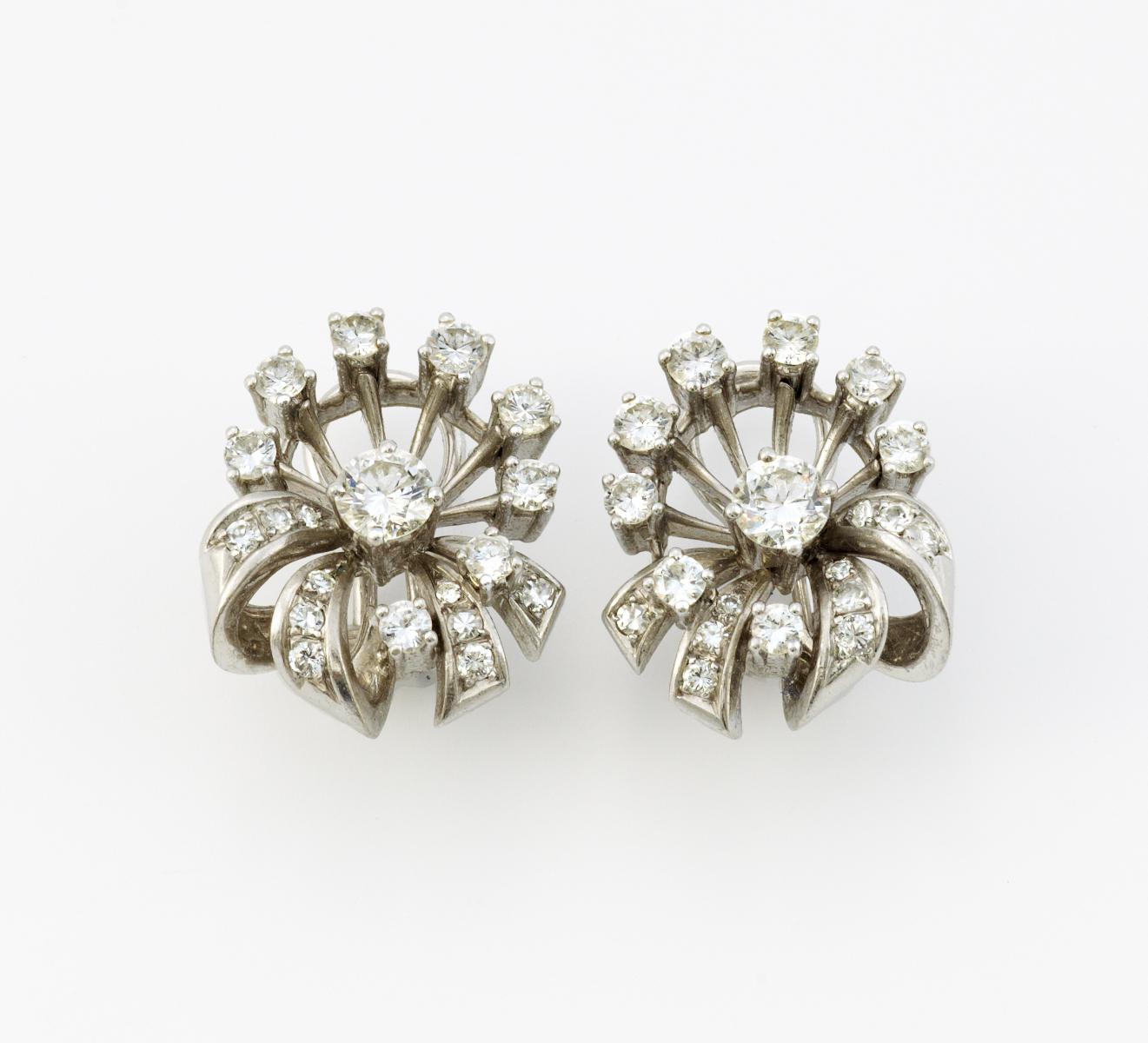 750/- Weißgold, Gewicht: 12,0g. D.ca. 2,0 x 1,6cm. 18 Brillanten zus.ca. 1,852ct W(H) VVS-VS, 20 winzige 8/8-Diamanten.